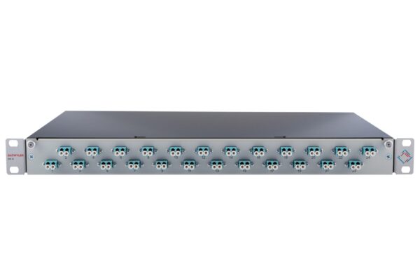 Fibre Optic Patch Panel, OV-S 19‘‘/1U, loaded with adapters & pigtails.6x LCD adapter, turqouise polymer housing with ceramic sleeve and 12 LC pigtails 2m G50/125µm OM3