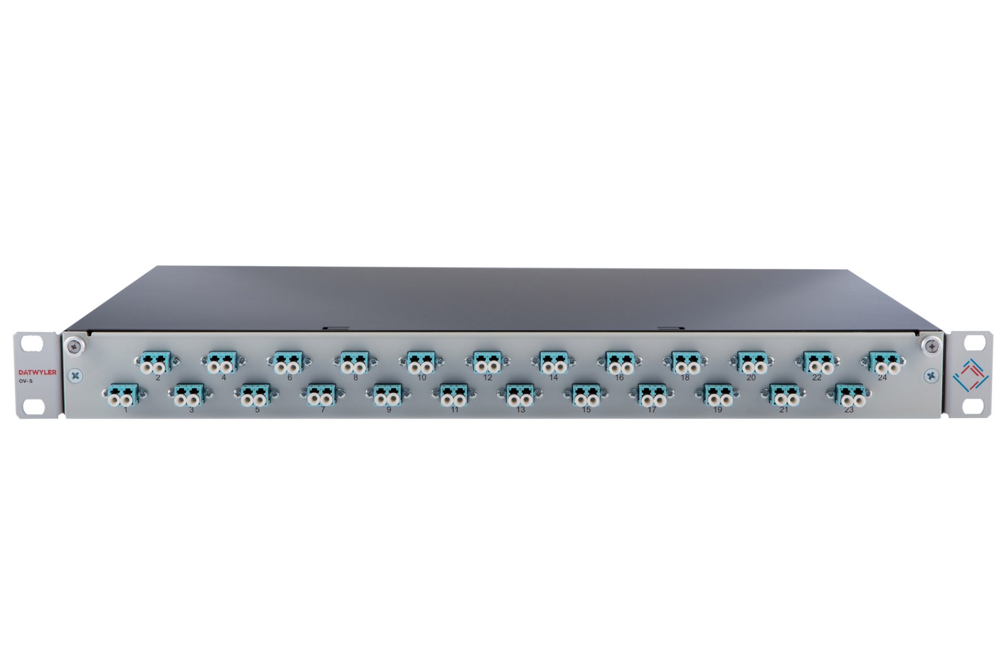 Fibre Optic Patch Panel, OV-S 19‘‘/1U, loaded with adapters & pigtails.12x LCD adapter, turqouise polymer housing with ceramic sleeve and 24 LC pigtails 2m G50/125µm OM3